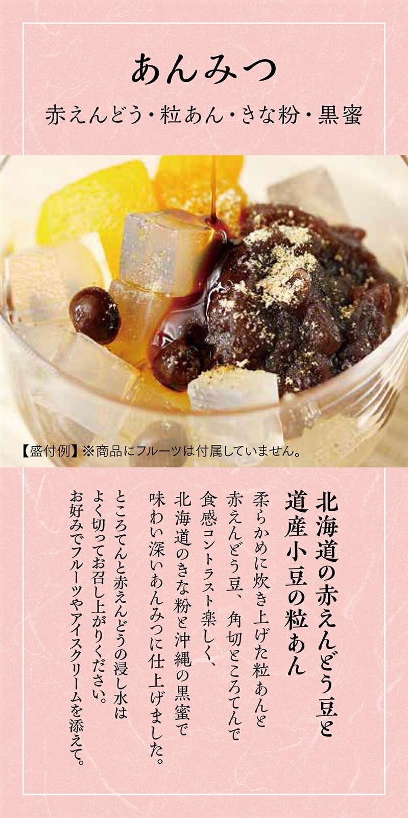 内容量:ところてん100g、豆20g、餡50g、黒蜜20g、黄粉3g