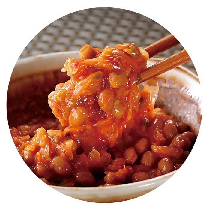 また、キムチはピリッとした辛さがありながらも、納豆とのバランスを考えて細かく刻まれているため、一緒に混ぜることで味の調和が取れ、食べやすくなっています。